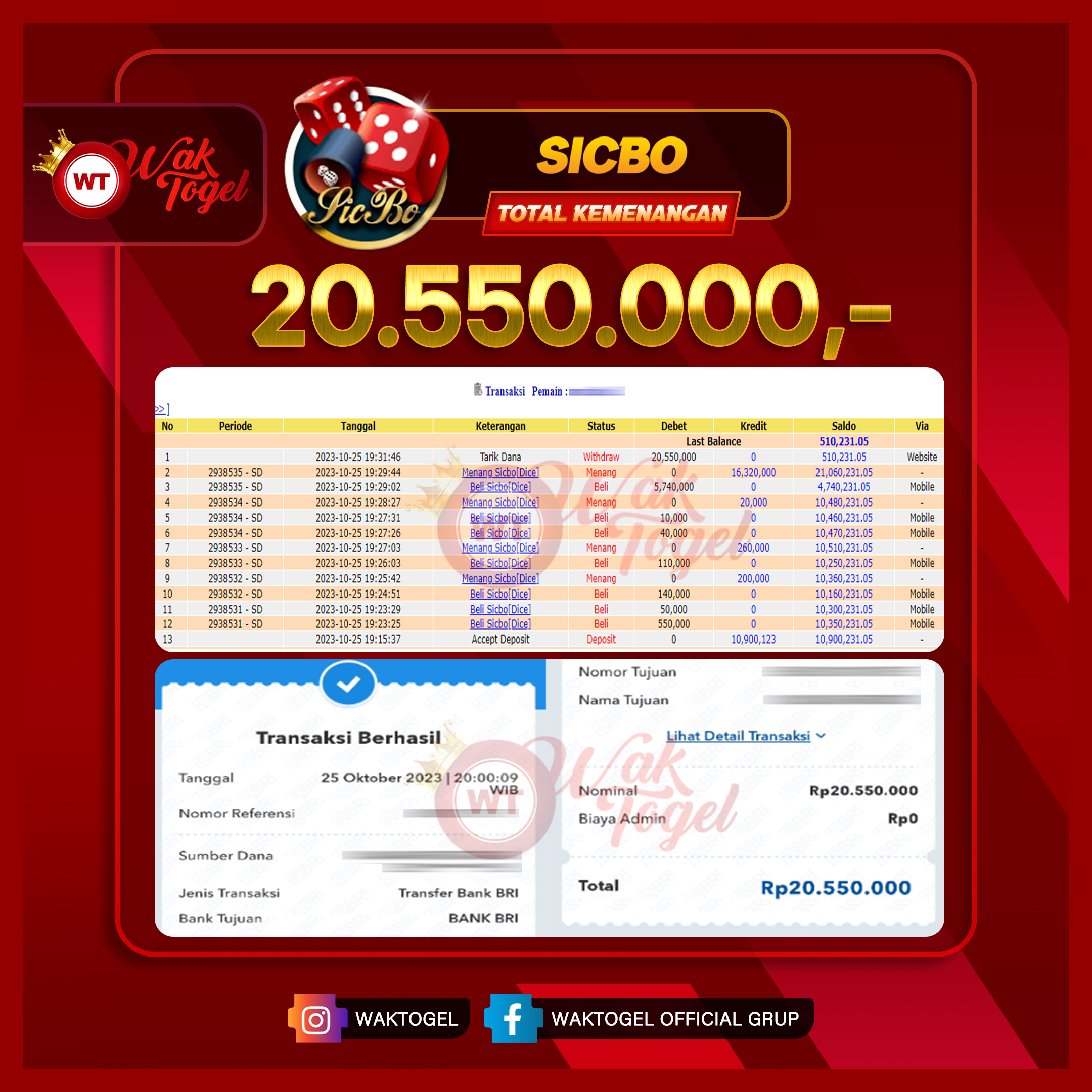 Kami ucapkan selamat kepada user ID : W*******3 telah berhasil withdraw sebesar Rp. 20.550.000 di game : SICBO. Bukti pembayaran jackpot member Waktogel kami bayar lunas dengan waktu paling singkat.