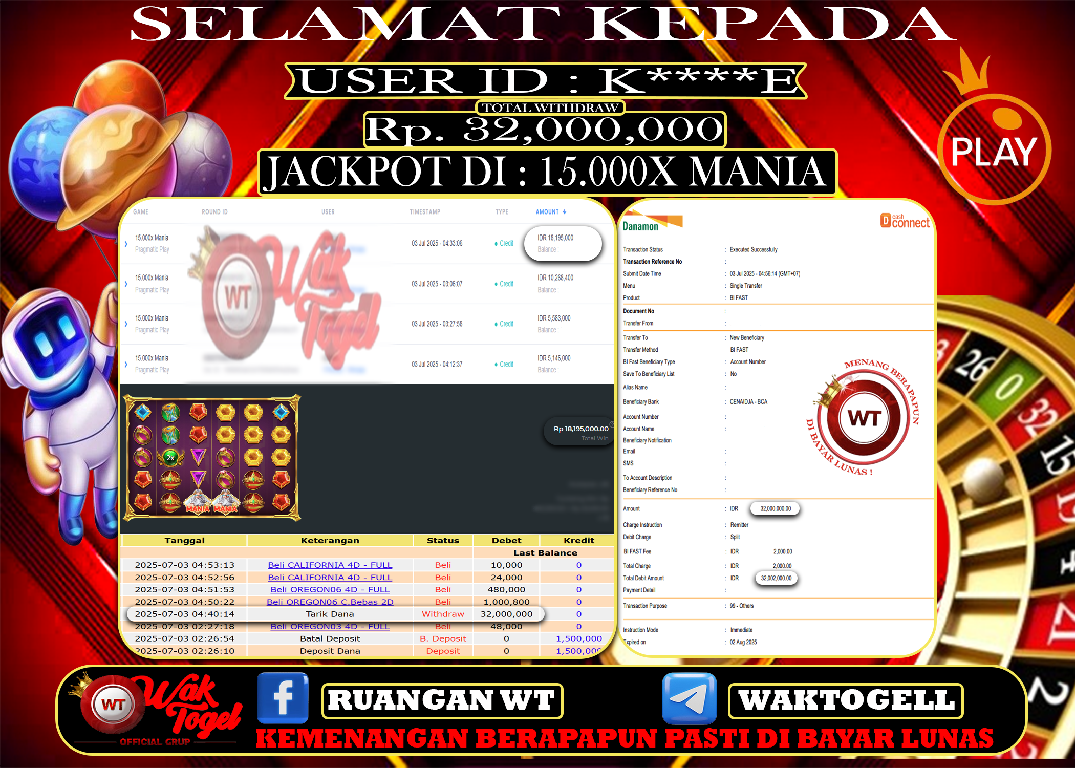 JACKPOT SLOT WAKTOGEL BUKTI PEMBAYARAN SLOT WAKTOGEL By JPWT Juni 27, 2025 0 comments 2 min read BUKTI PEMBAYARAN SLOT WAKTOGEL BUKTI PEMBAYARAN SLOT WAKTOGEL RP. 36,000,000 – GAME : SLOT 15.000X MANIA (USER ID : S*****0) TANGGAL |26-06-2025| CASH LUNAS ! […]
