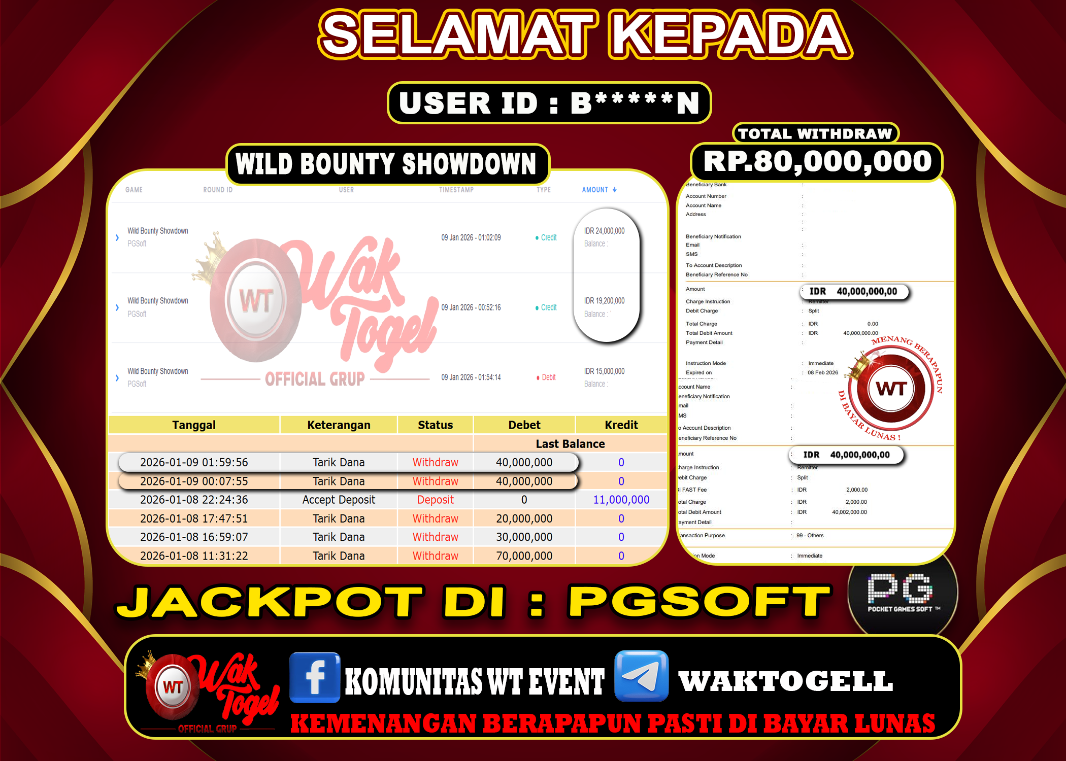 JACKPOT SLOT WAKTOGEL BUKTI PEMBAYARAN SLOT WAKTOGEL By JPWT Januari 9, 2026 0 comments 2 min read BUKTI PEMBAYARAN SLOT WAKTOGEL BUKTI PEMBAYARAN SLOT WAKTOGEL RP. 80,000,000 – GAME : SLOT WILD BOUNTY SHOWDOWN (USER ID : B*****N) TANGGAL |09-01-2026| CASH LUNAS […]