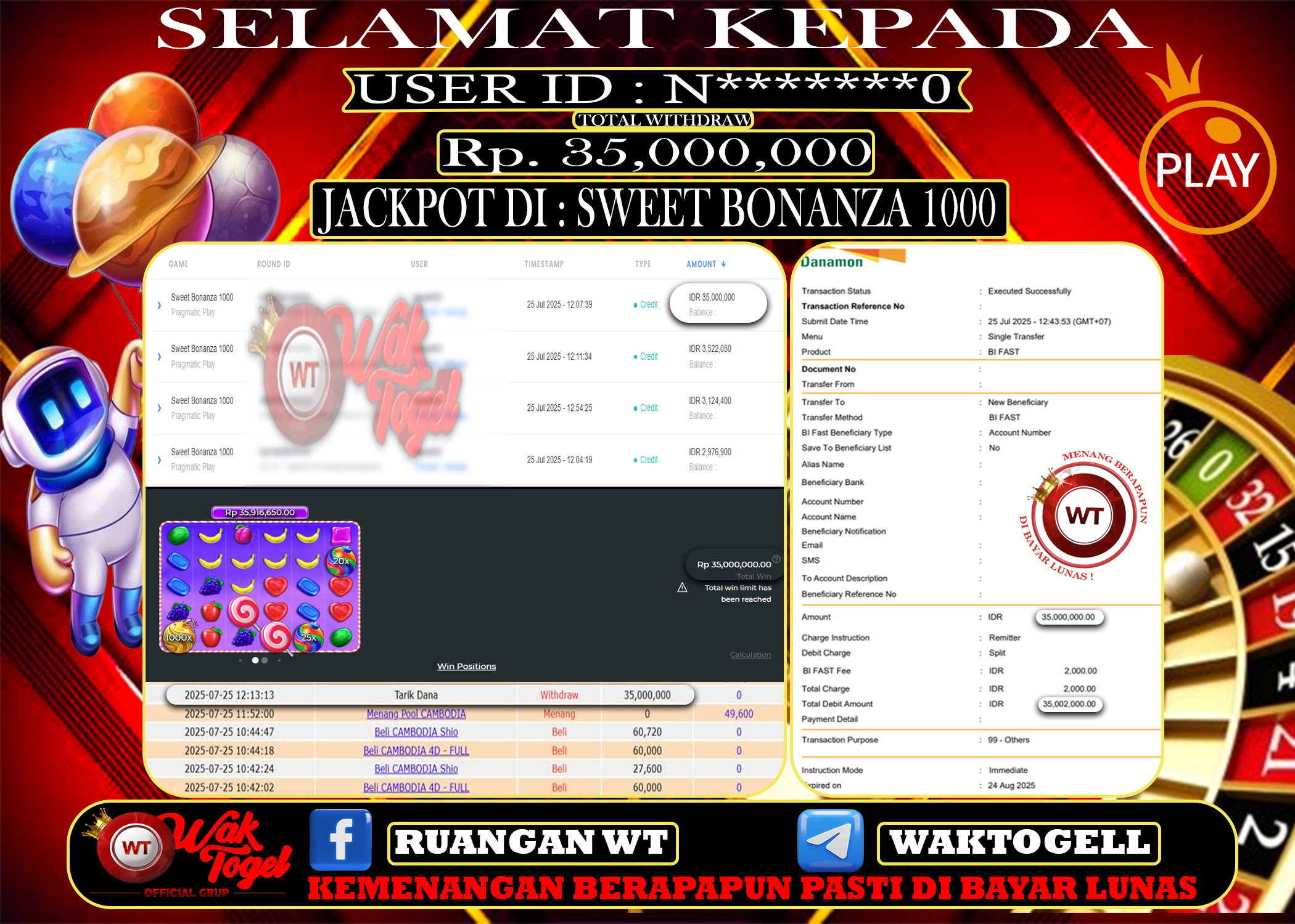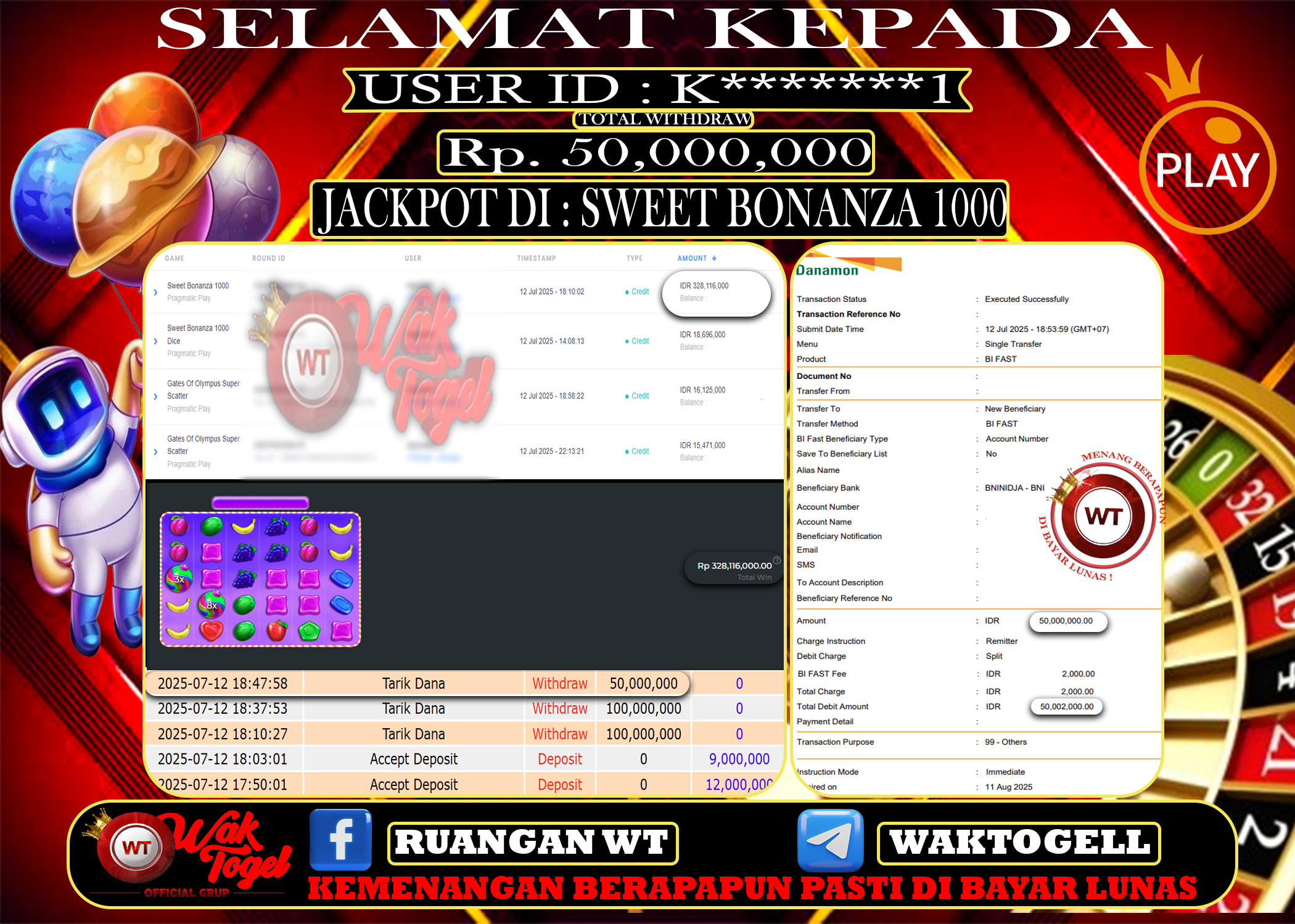 JACKPOT SLOT WAKTOGEL BUKTI PEMBAYARAN SLOT WAKTOGEL By JPWT Juli 13, 2025 0 comments 2 min read BUKTI PEMBAYARAN SLOT WAKTOGEL BUKTI PEMBAYARAN SLOT WAKTOGEL RP. 50,000,000 – GAME : SLOT SWEET BONANZA 1000 (USER ID : K*******1) TANGGAL |12-07-2025| CASH LUNAS […]