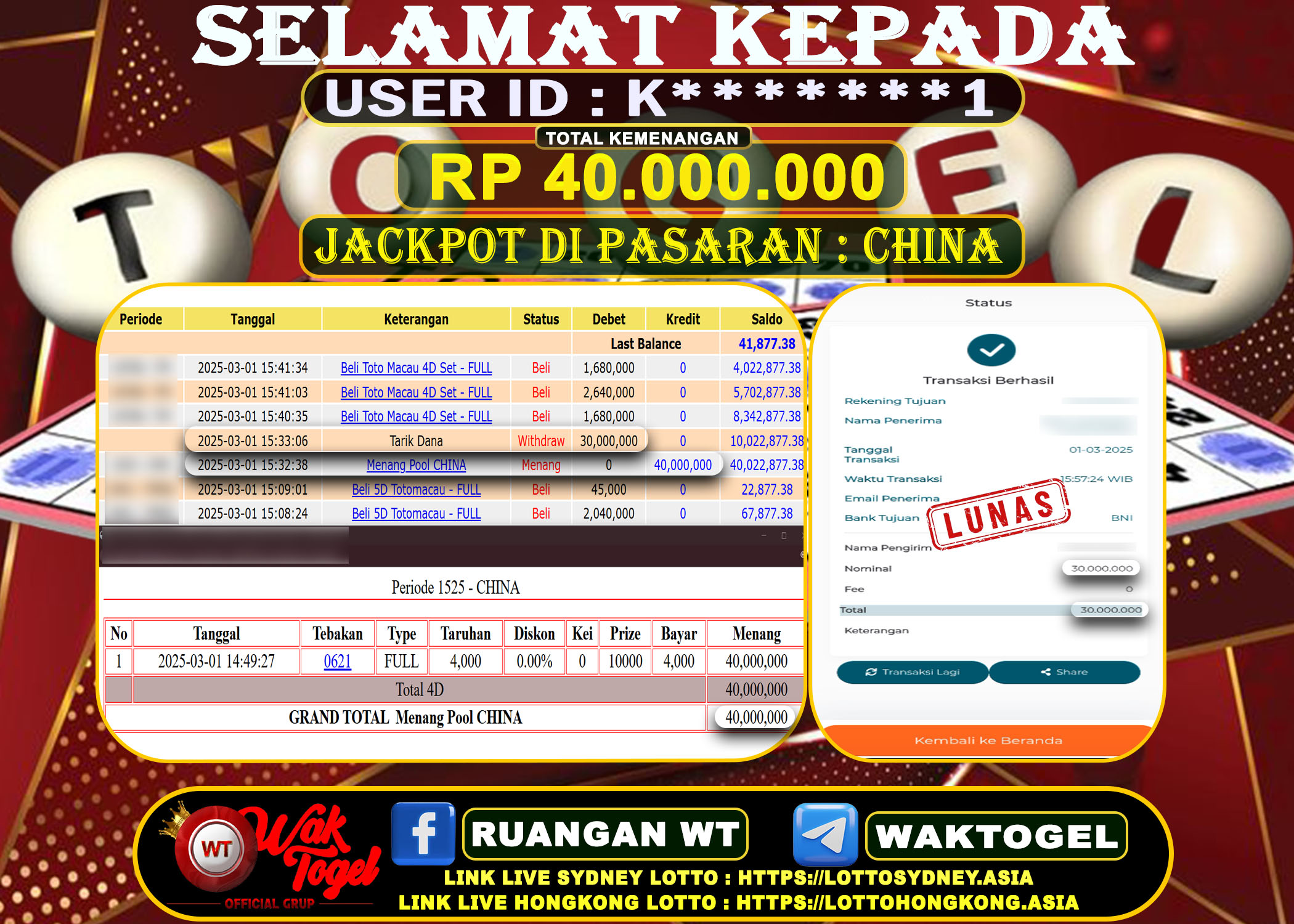 BUKTI PEMBAYARAN CHINA WAKTOGEL BUKTI PEMBAYARAN CHINA WAKTOGEL RP. 40,000,000 – GAME : TOGEL CHINA POOLS (USER ID : K*******1) TANGGAL |01-03-2025| CASH LUNAS ! […]