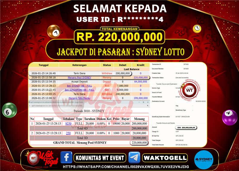 BUKTI PEMBAYARAN SYDNEY WAKTOGEL BUKTI PEMBAYARAN SYDNEY LOTTO WAKTOGEL RP. 220.000.000 – GAME : TOGEL SYDNEY LOTTO (USER ID : R*********4) TANGGAL |25-01-2026| CASH LUNAS […]